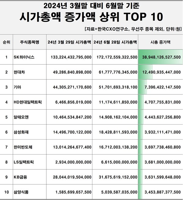대표적으로 SK하이닉스는 3월말 133조 2244억원에서 6월말 172조 1725억원으로 3개월 사이 38조 9481억원이 불어났다. 현대차도 같은 기간 49조 2868억원에서 61조 7777억원으로 12조 4909억원 증가했다. 두 종목의 2분기 시총 상승률은 각각 29.2%, 25.3%이다.