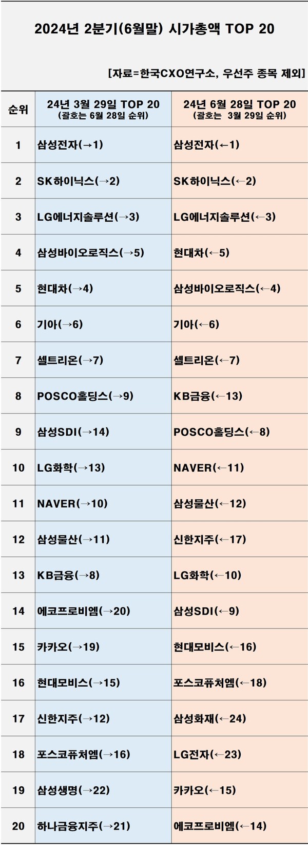 6월말 시총 톱 20에 새로 이름을 올린 종목을 보면 △삼성화재(24위→17위) △LG전자(23위→18위) 두 곳이다. 반면 △삼성생명(19위→22위) △하나금융지주(20위→21위) 두 곳은 2분기엔 시총 20위 밖으로 밀려났다.