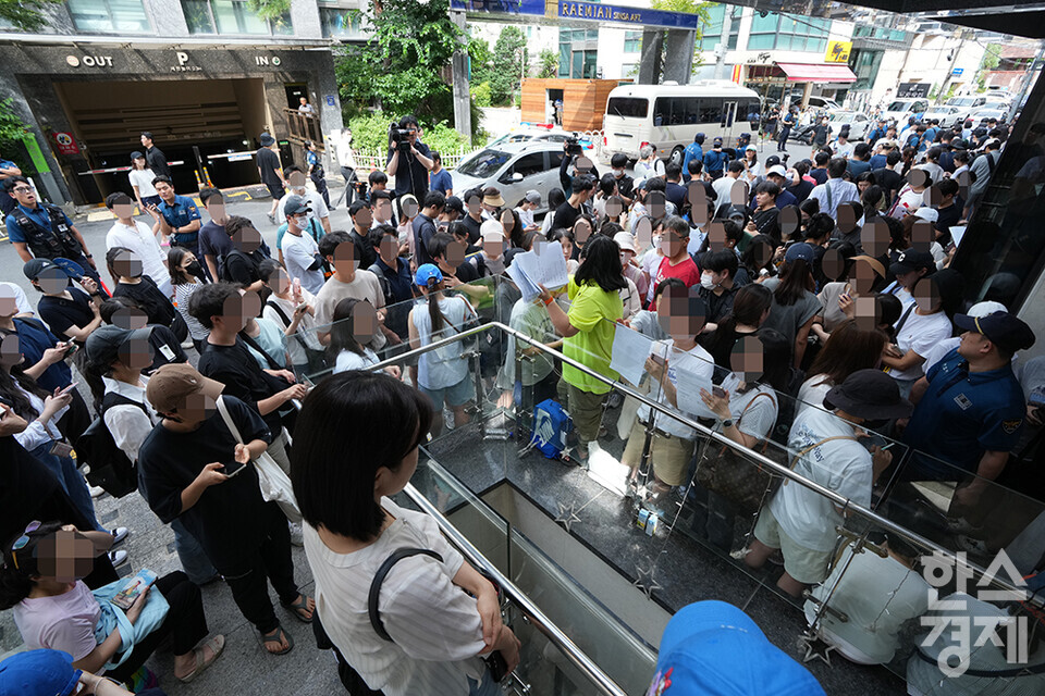 [한스경제=최대성 기자] 티몬 피해자들이 26일 오전 서울 강남구 티몬 신사옥 사무실에서 환불 접수를 하고 있다. 피해를 입은 소비자들은 자체적으로 만든 순번표에 따라 접수를 하고 있으며, 건물 밖에도 접수 대기 인원줄이 길게 이어져 있다.