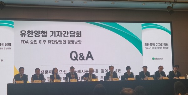 유한양행은 23일 오후 서울 여의도 콘래드서울 호텔에서 기자간담회를 개최하고 비소세포폐암 치료제 ‘렉라자’의 존슨앤드존슨(J&J) ‘리브리반트(성분명 아미반타맙)’ 병용요법이 FDA 승인 이후 경영방향에 대해 발표했다.