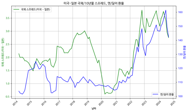 2022년 기준금리 인상에 따라 미국 10년물 국채 금리는 5%까지 가파르게 상승한 반면, 기준금리 인상이 없었던 일본 국채는 조금 오르는 수준에 그쳤고 1%에 못 미쳤다. 금리 차이로 인한 달러 강세, 엔화 약세 현상이 부각되었고, 환 투기세력까지 가세하면서 엔화는 150엔을 넘어 160엔마저 돌파했다.