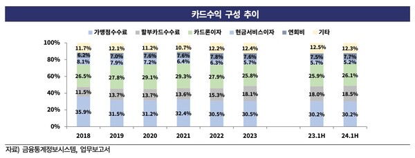 제도 도입 이후 주기마다 돌아오는 가맹점수수료율 재산정은 그동안엔 카드사들의 심각한 골칫거리였다. 그러나 최근엔 카드사들마다 적극적으로 수익기반 다각화를 추진했기에, 이러한 가맹점수수료에 대한 수익의존도가 낮아졌다. 카드수익에서 가맹점수수료가 차지하는 비중은 지난 2023년 46.7%에 달했지만, 올해 상반기 기준으론 30.2%까지 하락했다. 이는 카드론이자 26.1%, 할부카드수수료 18.5%, 연회비수익 7.7% 등 여타 수익들이 차지하는 비중이 증가했기 때문이다.