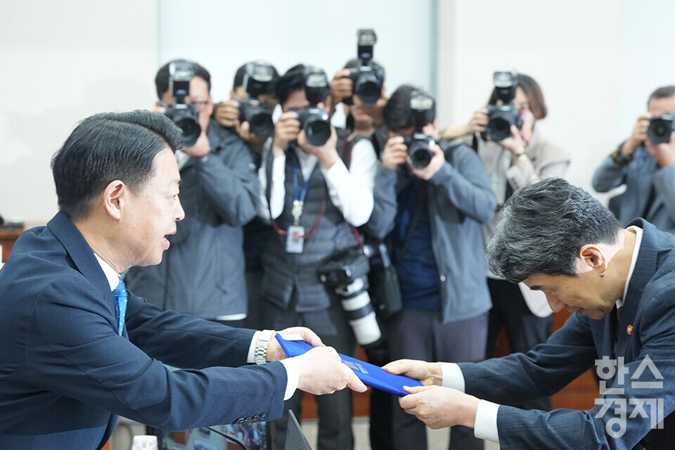 이주호 사회부총리 겸 교육부 장관이 8일 서울 여의도 국회에서 열린 교육위원회 국정감사에 출석해 증인선서문을 김영호 위원장에게 제출한 후 악수하고 있다. /최대성 기자 dpdaesung@sporbiz.co.kr 2024.10.08.