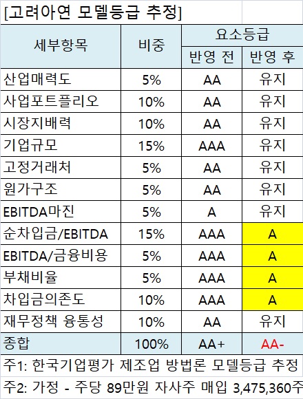 신용등급이 모델에 100% 연동되어 움직이지는 않지만, 이 정도의 큰 영향이라면 지난 9월 30일 신용평가를 하면서 등급전망을 '안정적'이라고 한 점과 이후에 대규모 자사주 매입계획 발표에 대해 신용등급에 반영하지 않은 점은 의문이다. 당시에 이미 경영권 분쟁은 치열해졌기 때문에 재무적 영향이 예상되었고, 이후 그 규모도 무시할 수 없는 규모로 나타났기 때문이다.