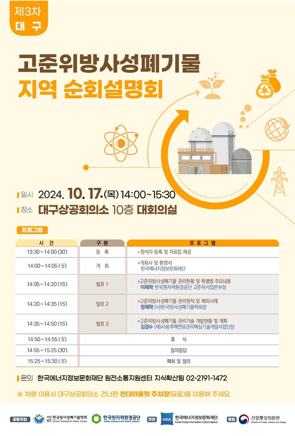 [한스경제=양세훈 기자] 한국에너지정보문화재단 원전소통지원센터(센터장 노동석, 이하 재단)는 17일 대구상공회의소 10층 대회의실에서 고준위방사성폐기물에 대한 이해를 높이고 국민과의 소통을 강화하기 위해 ‘제3차 고준위방사성폐기물 지역 순회설명회’를 개최했다고 밝혔다.