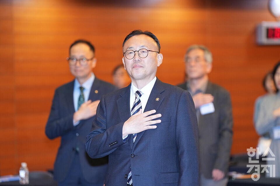 11일 서울 중구 포스트타워에서 행정안전부가 주최하고 건축공간연구원, 한국교통연구원, 손해보험협회가 주관하는 제8회 보행안전국제세미나가 열리고 있다. 행정안전부 이한경 재난안전관리본부장(가운데)을 비롯한 주요 내빈들이 국민의례를 하고 있다. /최대성 기자 dpdaesung@sporbiz.co.kr 2024.11.11.