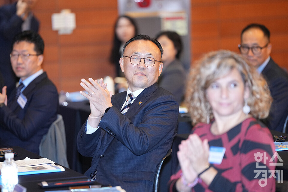 11일 서울 중구 포스트타워에서 행정안전부가 주최하고 건축공간연구원, 한국교통연구원, 손해보험협회가 주관하는 제8회 보행안전국제세미나가 열리고 있다. 행정안전부 이한경 재난안전관리본부장이 박수를 치고 있다. /최대성 기자 dpdaesung@sporbiz.co.kr 2024.11.11.