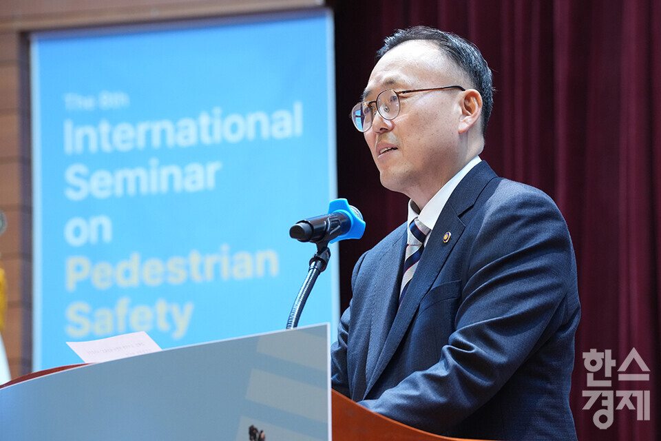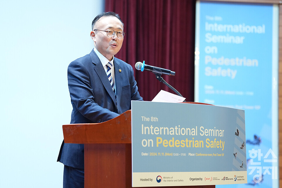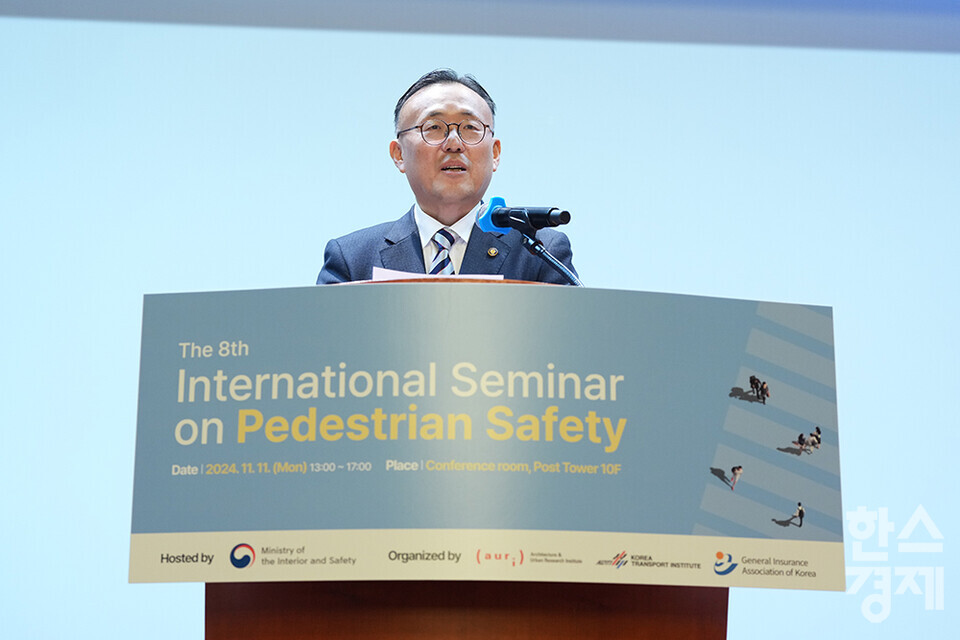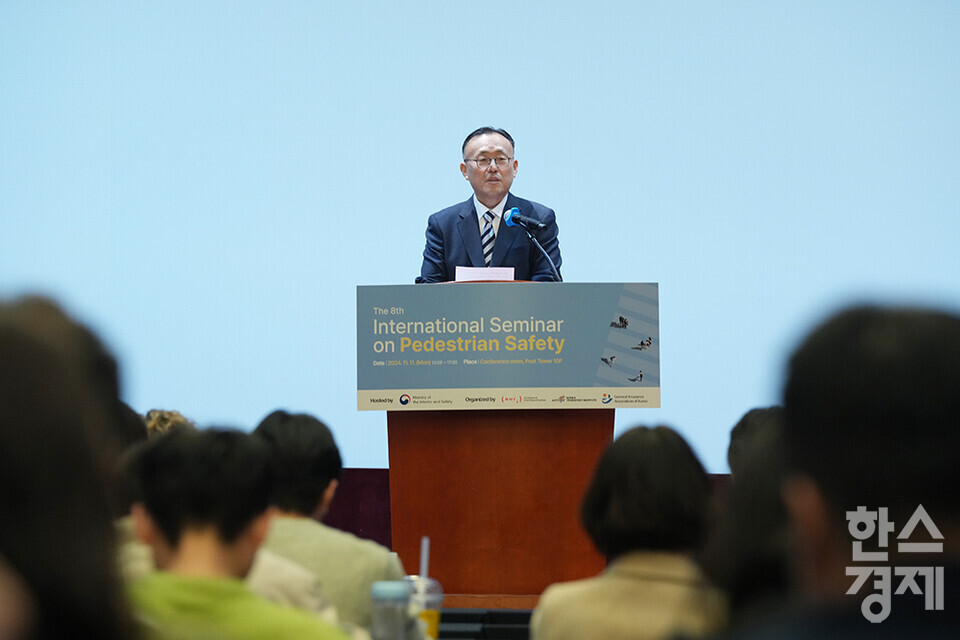 11일 서울 중구 포스트타워에서 행정안전부가 주최하고 건축공간연구원, 한국교통연구원, 손해보험협회가 주관하는 제8회 보행안전국제세미나가 열리고 있다. 행정안전부 이한경 재난안전관리본부장이 개회사를 하고 있다. /최대성 기자 dpdaesung@sporbiz.co.kr 2024.11.11.