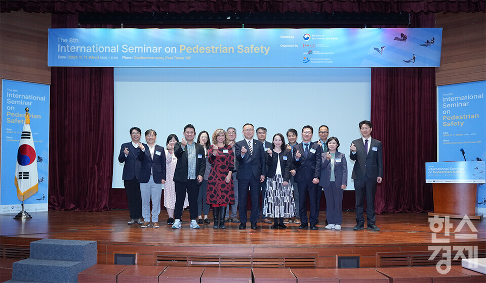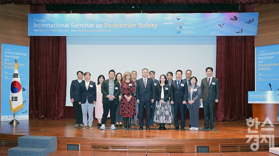 11일 서울 중구 포스트타워에서 행정안전부가 주최하고 건축공간연구원, 한국교통연구원, 손해보험협회가 주관하는 제8회 보행안전국제세미나가 열리고 있다. 행정안전부 이한경 재난안전관리본부장을 비롯한 주요 내빈들이 기념촬영을 하고 있다. /최대성 기자 dpdaesung@sporbiz.co.kr 2024.11.11.