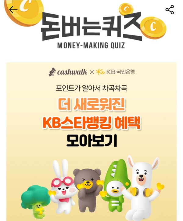 KB스타뱅킹 캐시워크돈버는퀴즈 정답자에게는 최대 1만캐시 포인트가 제공된다.