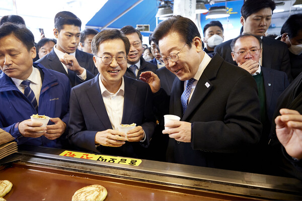 김동연 지사는 21일 이재명 더불어민주당 대표와 민주당 국회의원들과 함께 전통시장을 방문, 소상공인들의 애로사항을 청취하고 지역화폐 예산 반영의 필요성을 강조했다.