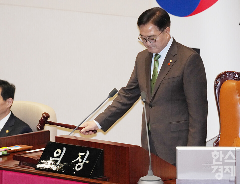 우원식 국회의장이 14일 오후 서울 여의도 국회 제419회 국회(임시회) 제4차 본회의에서 윤석열 대통령 탄핵소추안이 재석 300명 중 찬성 204명, 반대 85명, 기권 3명, 무효 8명으로 가결됐음을 알리며 의사봉을 두드리고 있다. /최대성 기자 dpdaesung@sporbiz.co.kr 2024.12.14.