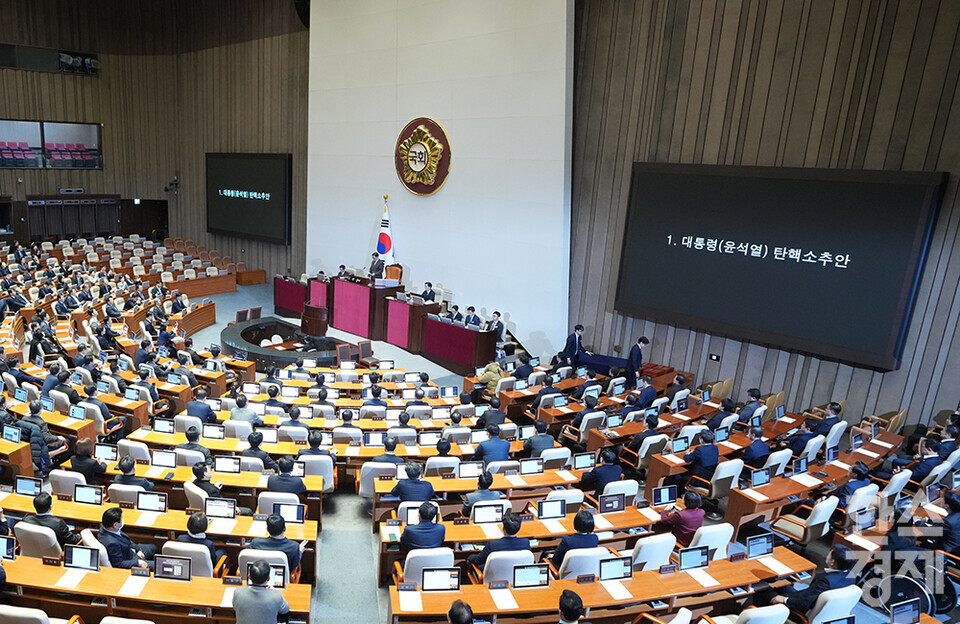 [한스경제=최대성 기자] 윤석열 대통령 탄핵소추안 재표결일인 14일 오후 서울 여의도 국회에서 제419회 국회(임시회) 제4차 본회의가 열리고 있다. 이날 무기명 투표로 진행된 윤 대통령 탄핵소추안은 찬성 204표로 가결됐다.