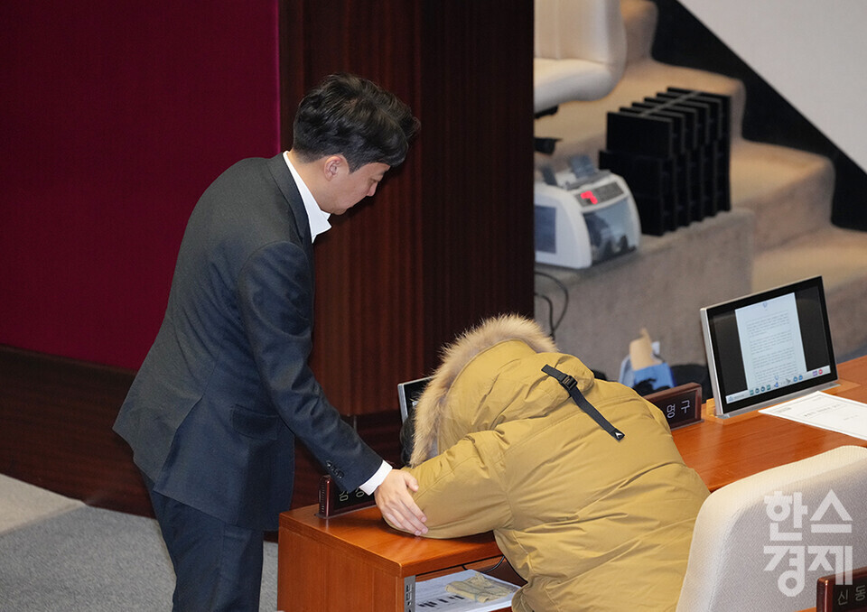 14일 오후 서울 여의도 국회 제419회 국회(임시회) 제4차 본회의에서 윤석열 대통령 탄핵소추안이 재석 300명 중 찬성 204명, 반대 85명, 기권 3명, 무효 8명으로 가결된 후 찬성표를 던진 국민의힘 김상욱 의원이 자리에서 일어나지 못하고 있다. 이에 개혁신당 이준석 의원이 가장 먼저 다가와 손을 잡아주고 있다. /최대성 기자 dpdaesung@sporbiz.co.kr 2024.12.14.