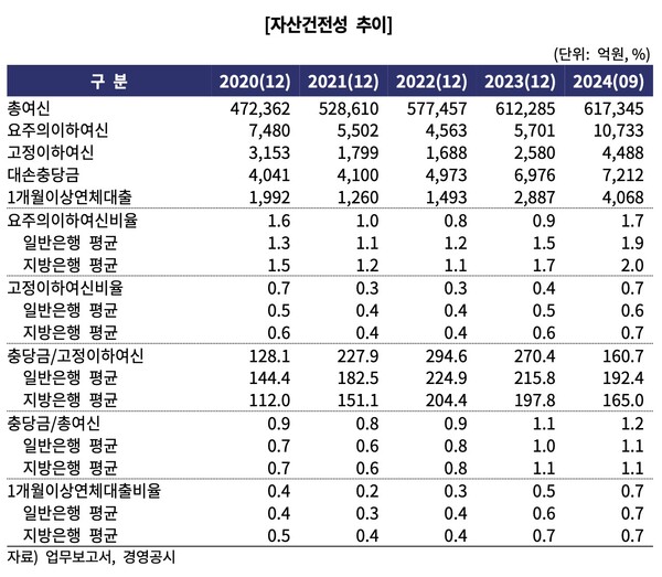 아울러 총여신 중 건전성 저하가 우려되는 업종의 비중이 20.1%라는 점도 모니터링 필요성을 야기한다. 이는 지방은행 평균 수준이라고 하지만, 이중에서 요주의이하여신비율은 3.5%, 고정이하여신비율은 1.6%(2023년 말 0.3%)로 크게 상승했다.
