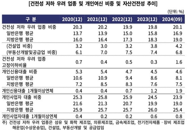 총여신 중 건전성 저하 우려되는 업종 비율 20.1%