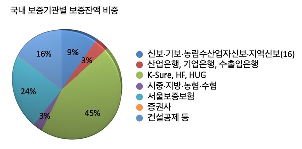 민간 부문은 단연 서울보증의 비중이 가장 크다. 이외에도 시중·지방·농협·수협 등 은행권이 59.6조원(3.1%), 증권사가 7000억원(0.1%), 건설공제조합 등이 303.9조원(15.8%) 가량의 비중이다.