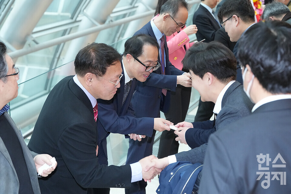 27일 오전 서울 여의도 FKI타워에서 한스경제 창간 10주년 기념 ‘체인지 코리아(Change Korea) 2025 포럼’이 열리고 있다. 송진현 한스경제 대표발행인을 비롯한 임직원들이 행사장을 찾은 내빈들과 인사를 나누고 있다. /최대성 기자 dpdaesung@sporbiz.co.kr 2025.03.27.