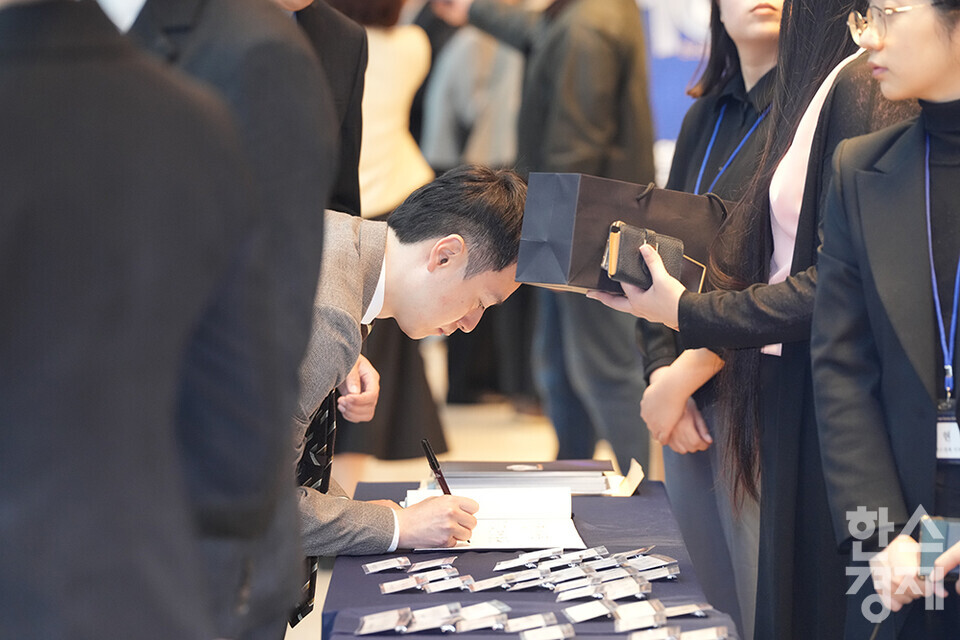 27일 오전 서울 여의도 FKI타워에서 한스경제 창간 10주년 기념 ‘체인지 코리아(Change Korea) 2025 포럼’이 열리고 있다. 내빈들이 방명록을 작성하고 있다. /최대성 기자 dpdaesung@sporbiz.co.kr 2025.03.27.