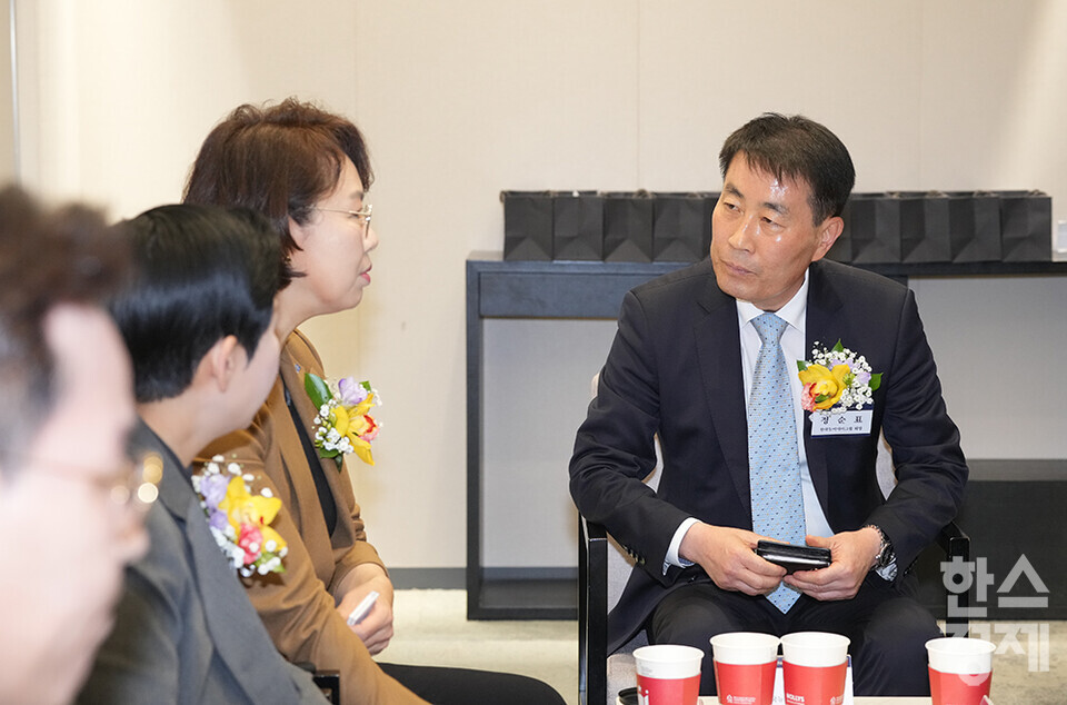 정순표 한국뉴미디어 회장이 27일 오전 서울 여의도 FKI타워에서 개최된 한스경제 창간 10주년 기념 ‘체인지 코리아(Change Korea) 2025 포럼’에 앞서 주요 내빈들과 환담을 하고 있다. /최대성 기자 dpdaesung@sporbiz.co.kr 2025.03.27.