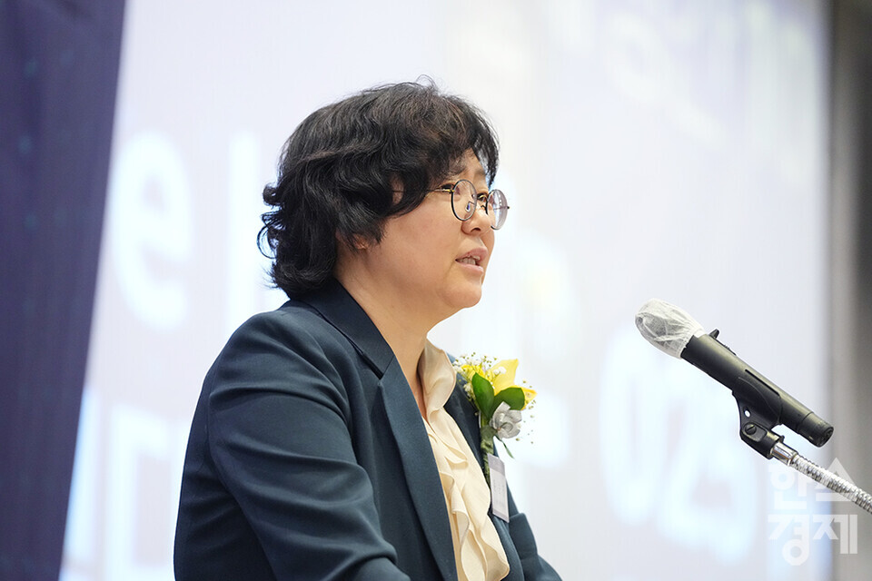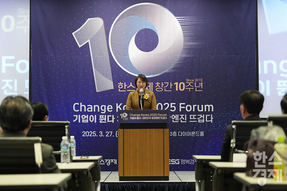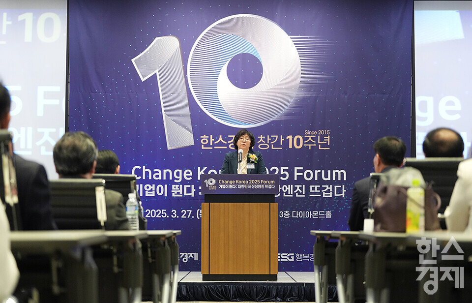 윤순진 서울대 환경대학원장이 27일 오전 서울 여의도 FKI타워에서 개최된 한스경제 창간 10주년 기념 ‘체인지 코리아(Change Korea) 2025 포럼’에 참석해 축사를 하고 있다. /최대성 기자 dpdaesung@sporbiz.co.kr 2025.03.27.