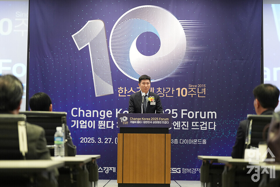정주호 한스경제 편집국장이 27일 오전 서울 여의도 FKI타워에서 개최된 한스경제 창간 10주년 기념 ‘체인지 코리아(Change Korea) 2025 포럼’에 참석해 내빈들에게 인사하고 있다. /최대성 기자 dpdaesung@sporbiz.co.kr 2025.03.27.