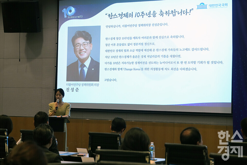 진성준 더불어민주당 정책위의장이27일 오전 서울 여의도 FKI타워에서 개최된 한스경제 창간 10주년 기념 ‘체인지 코리아(Change Korea) 2025 포럼’에서 영상으로 축사를 전하고 있다. /최대성 기자 dpdaesung@sporbiz.co.kr 2025.03.27.