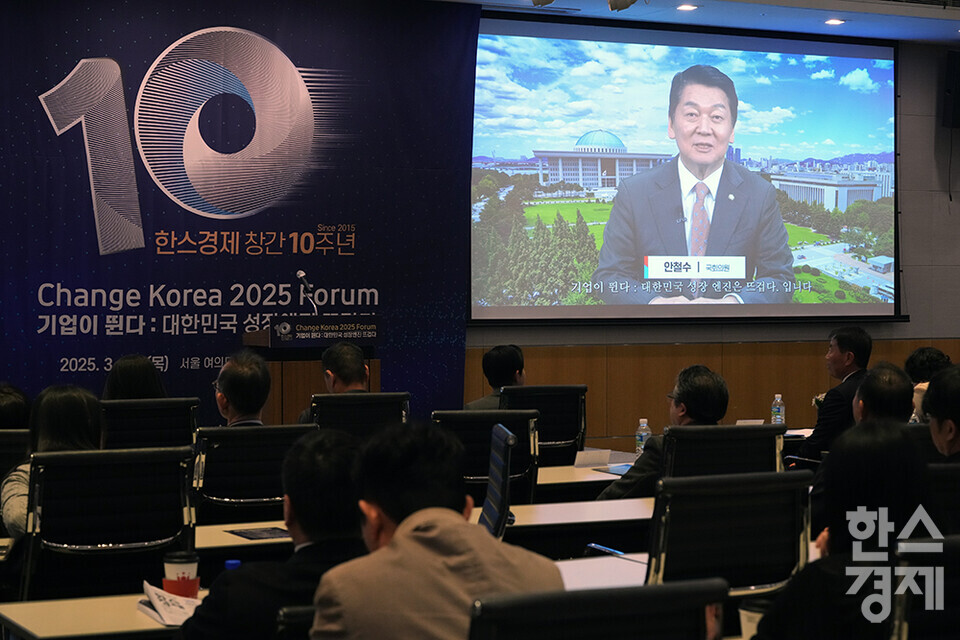 안철수 국민의힘 의원이 27일 오전 서울 여의도 FKI타워에서 개최된 한스경제 창간 10주년 기념 ‘체인지 코리아(Change Korea) 2025 포럼’에서 영상으로 축사를 전하고 있다. /최대성 기자 dpdaesung@sporbiz.co.kr 2025.03.27.