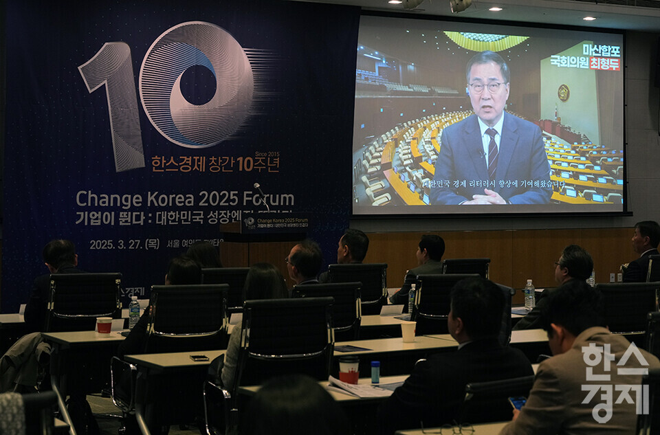 최형두 국민의힘 의원이 27일 오전 서울 여의도 FKI타워에서 개최된 한스경제 창간 10주년 기념 ‘체인지 코리아(Change Korea) 2025 포럼’에서 영상으로 축사를 전하고 있다. /최대성 기자 dpdaesung@sporbiz.co.kr 2025.03.27.