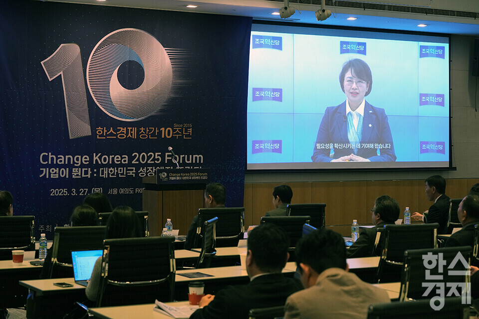 백선희 조국혁신당 의원이 27일 오전 서울 여의도 FKI타워에서 개최된 한스경제 창간 10주년 기념 ‘체인지 코리아(Change Korea) 2025 포럼’에서 영상으로 축사를 전하고 있다. /최대성 기자 dpdaesung@sporbiz.co.kr 2025.03.27.
