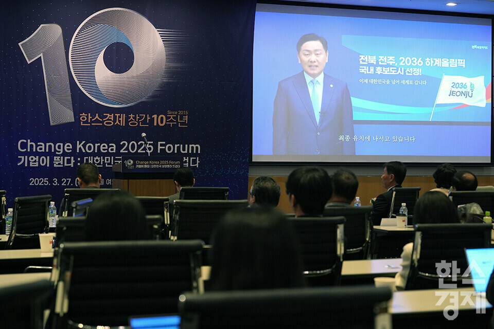 김관영 전북특별자치도지사가 27일 오전 서울 여의도 FKI타워에서 개최된 한스경제 창간 10주년 기념 ‘체인지 코리아(Change Korea) 2025 포럼’에서 영상으로 축사를 전하고 있다. /최대성 기자 dpdaesung@sporbiz.co.kr 2025.03.27.