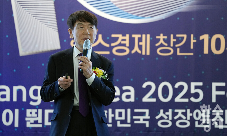 [한스경제=최대성 기자] 27일 오전 서울 여의도 FKI타워에서 한스경제 창간 10주년 기념 ‘체인지 코리아(Change Korea) 2025 포럼’이 열렸다. 한스경제, 한국스포츠경제, ESG행복경제연구소가 주최하는 이번 포럼은 '기업이 뛴다 : 대한민국 성장엔진 뜨겁다'를 주제로 개최됐다. 이날 현정택 정석인하학원 이사장이 '트럼프2.0시대 한국경제 전망'을 주제로 기조 강연을 한 후 이영탁 SK텔레콤 부사장, 정윤택 제약산업전략연구원장, 김연명 중앙대 사회복지학과 교수, 이정동 서울대 공학전문대학원 교수, 윤순진 서울대 환경대학원장의 주제 강연이 이어졌다.