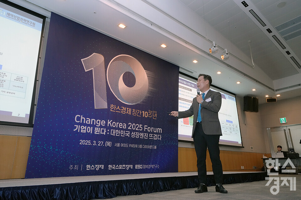 이정동 서울대 공학전문대학원 교수가 27일 오전 서울 여의도 FKI타워에서 개최된 한스경제 창간 10주년 기념 ‘체인지 코리아(Change Korea) 2025 포럼’에 참석해 '기술패권시대, 혁신성장 견인하는 기술선진국의 조건'을 주제로 강연하고 있다. /최대성 기자 dpdaesung@sporbiz.co.kr 2025.03.27.
