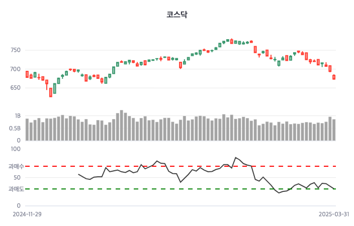 코스닥 지수는 이날 683.42에 출발해 686.17을 고점으로 기록한 뒤 672.85로 거래를 마쳤다. 전거래일 대비 20.91포인트(-3.01%) 하락했고, 시작가보다는 10.57포인트(-1.55%) 하락했다.