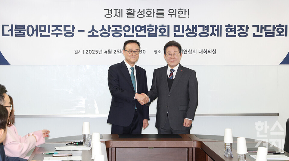 2일 오후 서울 영등포구 소상공인연합회에서 더불어민주당-소상공인연합회 민생경제 현장 간담회가 열리고 있다. 송치영 소상공인연합회 회장과 이재명 더불어민주당 대표가 악수하고 있다. /최대성 기자 dpdaesung@sporbiz.co.kr 2025.04.02.