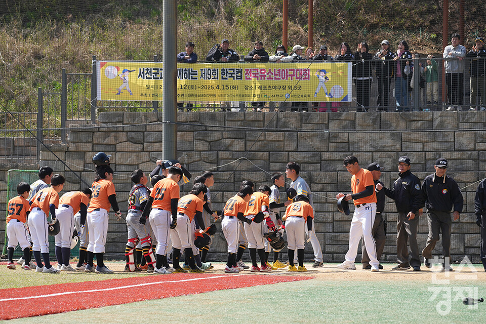 15일 충청남도 서천군 레포츠야구장에서 한국스포츠경제와 한스경제가 주최하고 대한유소년야구연맹이 주관하는 '제9회 한국컵 전국유소년아구대회'가 열렸다. 꿈나무(청룡)리그 송파구 유소년야구단 선수들이 안양시와의 결승전을 치른 후 관중석을 향해 인사하고 있다. /서천=최대성 기자 dpdaesung@sporbiz.co.kr 2025.04.15.