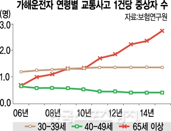 고령 운전자의 교통사고는 피해 정도가 크다. 같은 해 기준 40대 운전자의 교통사고 1건당 중상자 수는 0.40인데 비해 65세 이상 운전자의 교통사고 당 중상자수는 2.75명으로 집계됐다.