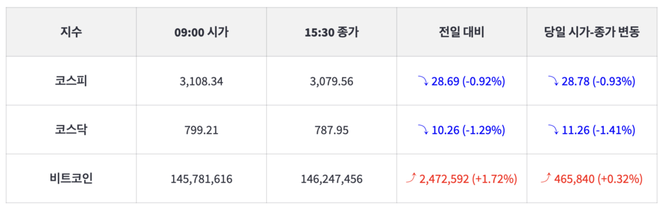 금일 코스피와 코스닥 모두 차익실현과 더불어 조정 국면을 맞이한 것으로 보인다. 전 거래일 3100을 돌파했던 코스피는 3100 밑으로 하회했고, 코스닥 또한 800선 밑으로 하회하며 하락 마감했다.
