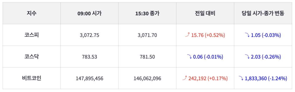 금일 코스피는 외인의 매도세와 기관의 매수세가 팽팽하게 유지되면서 3070선을 지키며 강보합 마감했다. 반면 코스닥은 장중 상승세를 보였으나, 하락을 동반하면서 약보합 마감했다.