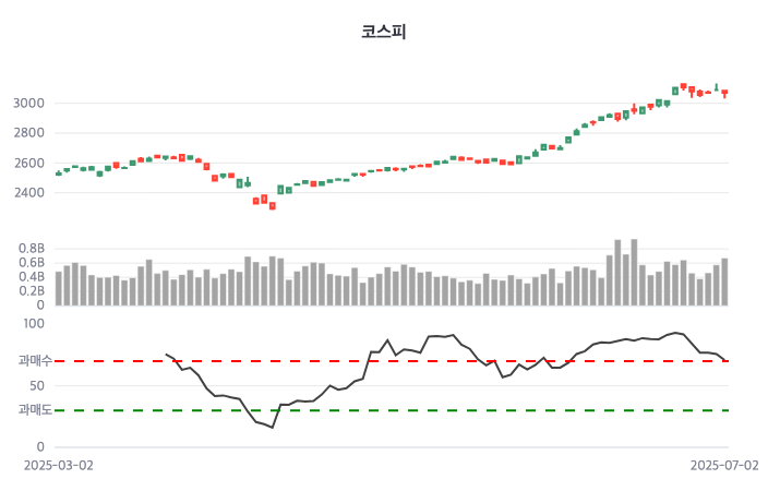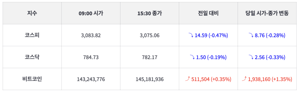 [한스경제=김도현 기자] 2일 코스피는 전거래일보다 -0.47% 하락 마감했다. 한국거래소에 의하면 코스피 지수는 이날 오전 09시 3083.82에 개장해 장중 3090.61을 고점 기록한 후 오후 3시 30분 3075.06로 하락 마감했다. 전거래일 대비 14.59포인트(-0.47%) 하락했으며, 이날 시작가 대비해서는 8.76포인트(-0.28%) 하락한 것이다.