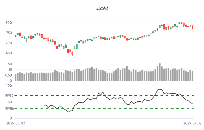 코스닥 지수는 이날 784.73에 출발해 787.11을 고점으로 기록한 뒤 782.17로 거래를 마쳤다. 전거래일 대비 1.5포인트(-0.19%) 하락했고, 시작가보다는 2.56포인트(-0.33%) 하락했다.