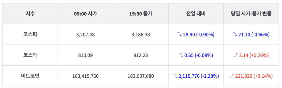 금일 코스피와 코스닥은 숨고르기를 보였다. 코스피는 외인과 기관의 순매도 강세로 장중 약보합이 지속되었으며 하락 마감했다. 코스닥 또한 외인과 기관의 순매도 강세로 약보합 마감했다.