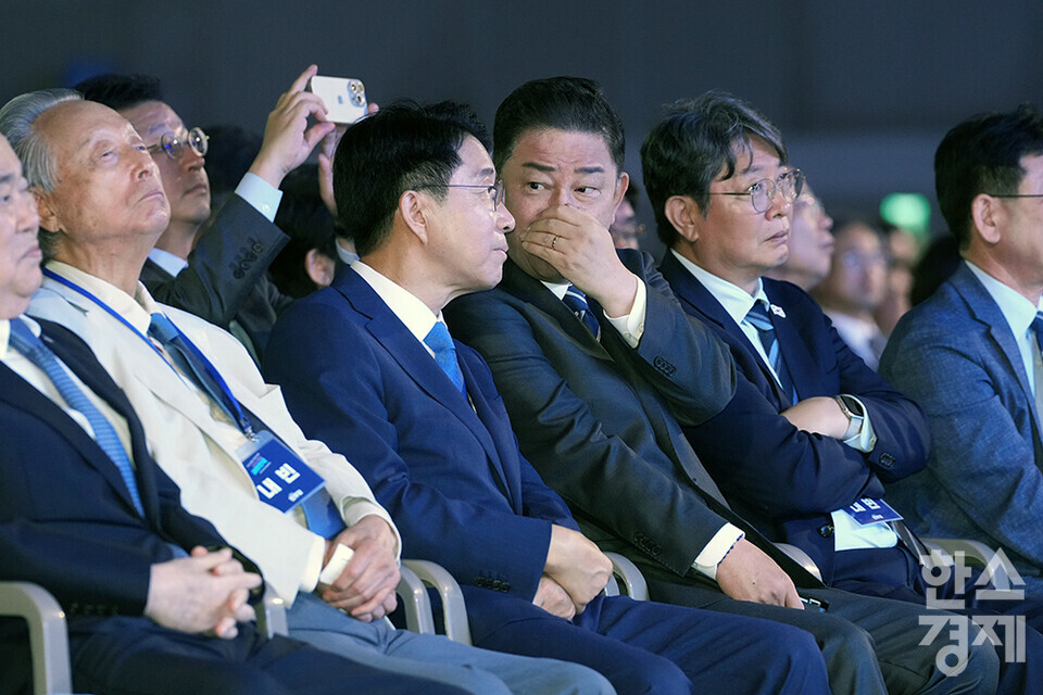 김민석 국무총리(왼쪽부터), 강훈식 비서실장, 우상호 정무수석, 김병욱 정무비서관이 2일 오후 경기도 고양시 킨텍스에서 열린 더불어민주당 제2차 임시전국당원대회에 참석하고 있다. /최대성 기자 dpdaesung@sporbiz.co.kr 2025.08.02.