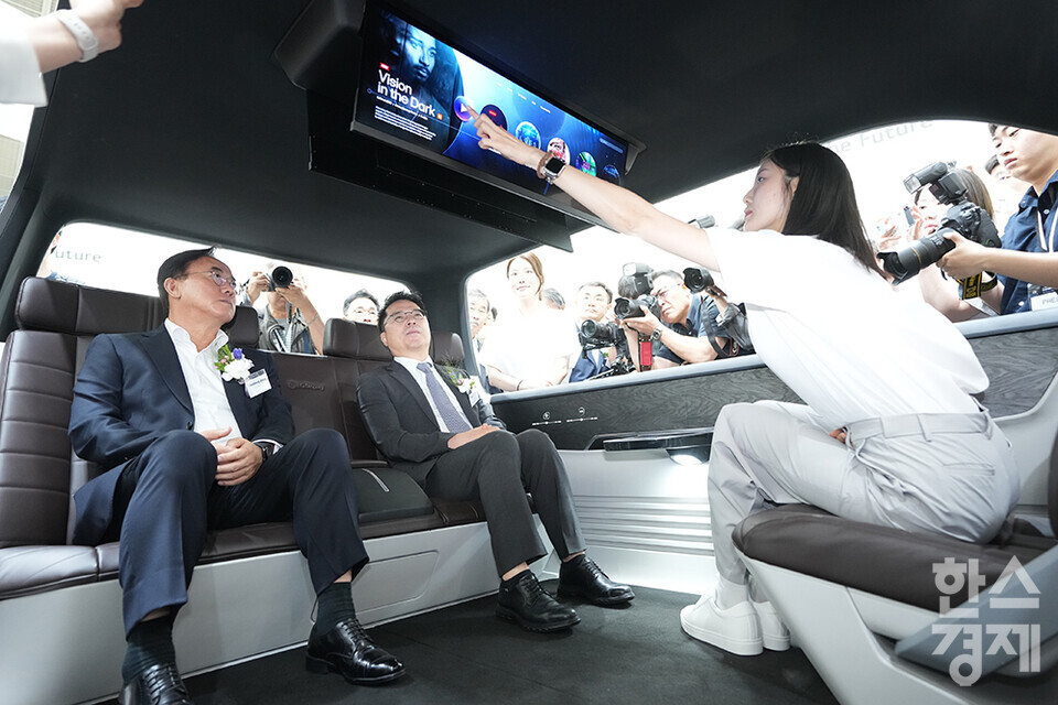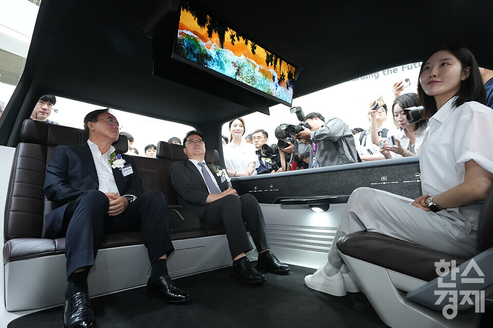 최신 디스플레이 기술을 한자리에서 볼 수 있는 '2025 한국디스플레이산업전시회(K-Display 2025)'가 7일 서울 강남구 코엑스에서 열리고 있다. 정철동 LG디스플레이(왼쪽) 사장과 문신학 산업통상자원부 차관이 LG디스플레이 부스에 마련된 콘셉트카에 앉아 내부 디스플레이를 통해 영상통화하는 영상을 살피고 있다. /최대성 기자 dpdaesung@sporbiz.co.kr 2025.08.07.