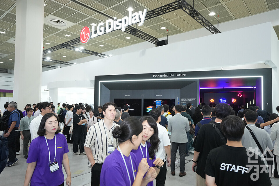 최신 디스플레이 기술을 한자리에서 볼 수 있는 '2025 한국디스플레이산업전시회(K-Display 2025)'가 7일 서울 강남구 코엑스에서 열리고 있다. 관람객들이 LG디스플레이 부스를 살피고 있다. /최대성 기자 dpdaesung@sporbiz.co.kr 2025.08.07.