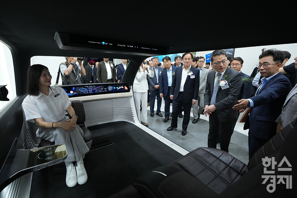 최신 디스플레이 기술을 한자리에서 볼 수 있는 '2025 한국디스플레이산업전시회(K-Display 2025)'가 7일 서울 강남구 코엑스에서 열리고 있다. 정철동 LG디스플레이(왼쪽) 사장과 문신학 산업통상자원부 차관이 LG디스플레이 부스에 마련된 콘셉트카에 앉아 내부 디스플레이 영상을 살피고 있다. /최대성 기자 dpdaesung@sporbiz.co.kr 2025.08.07.
