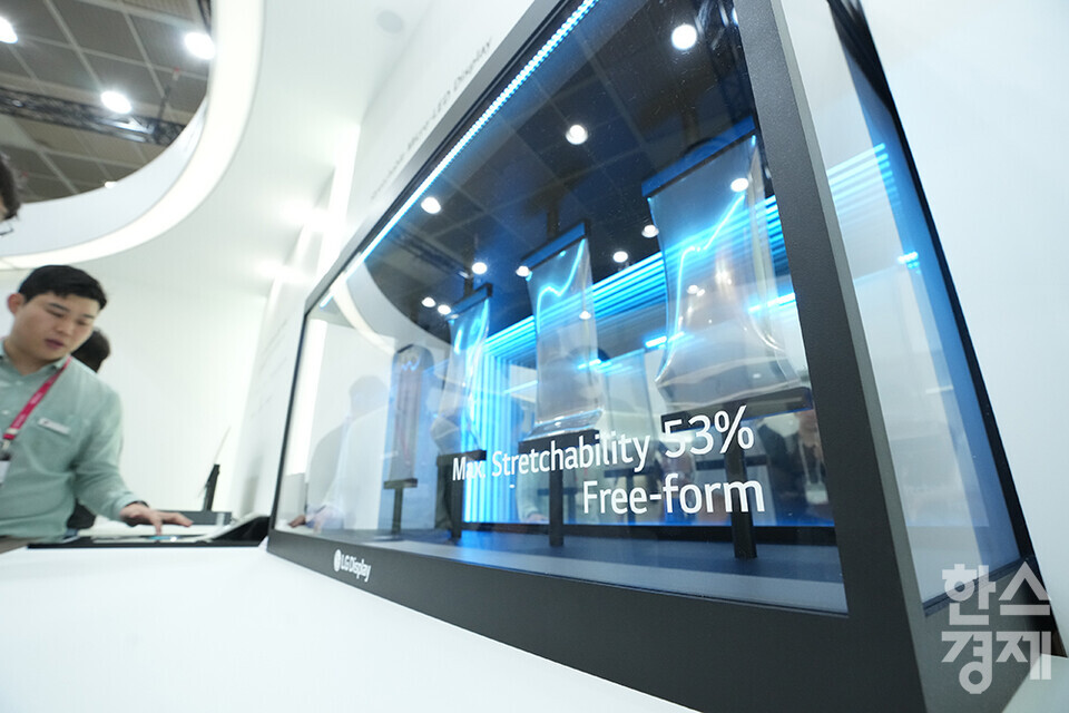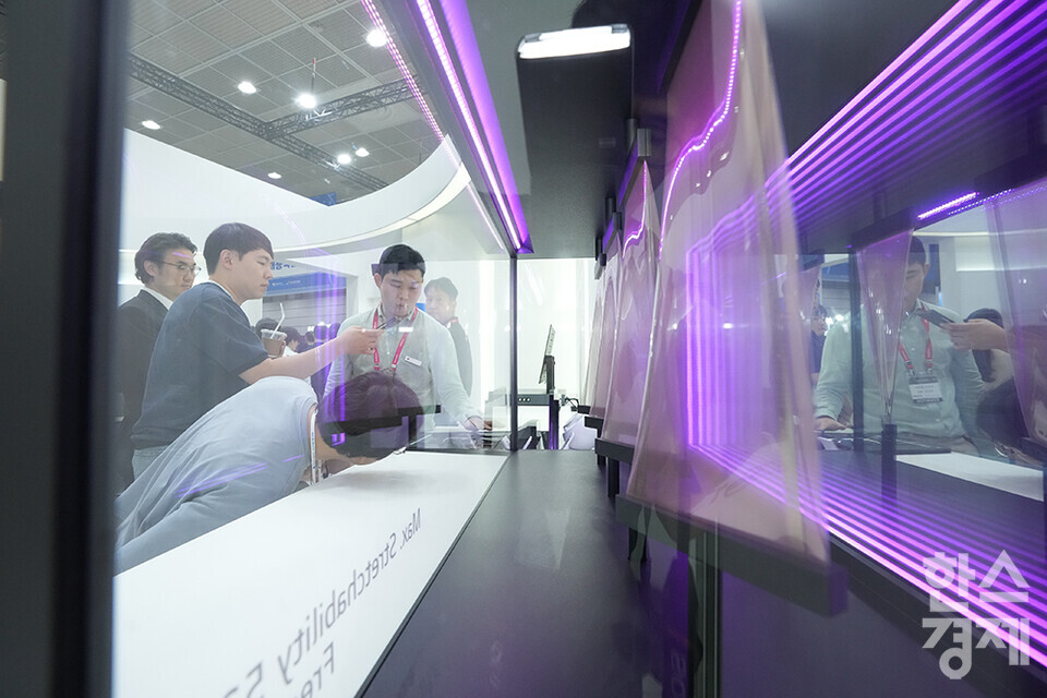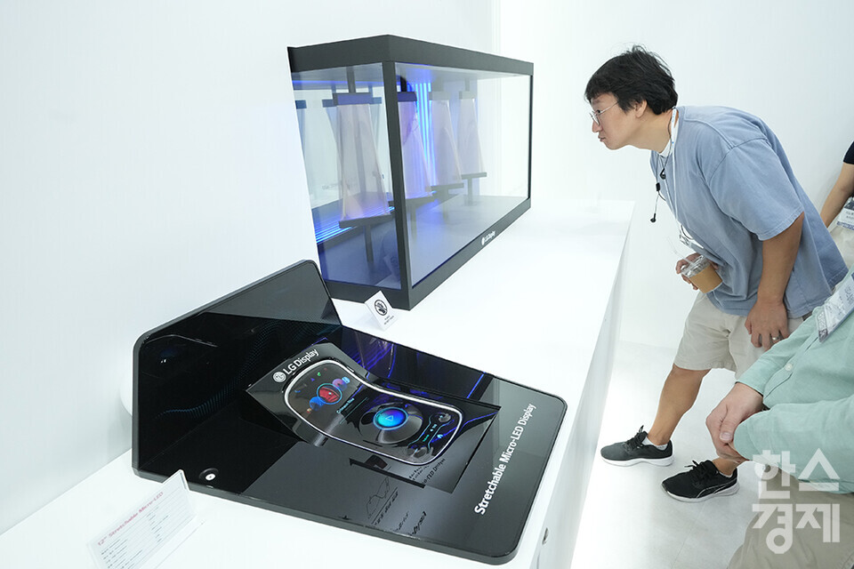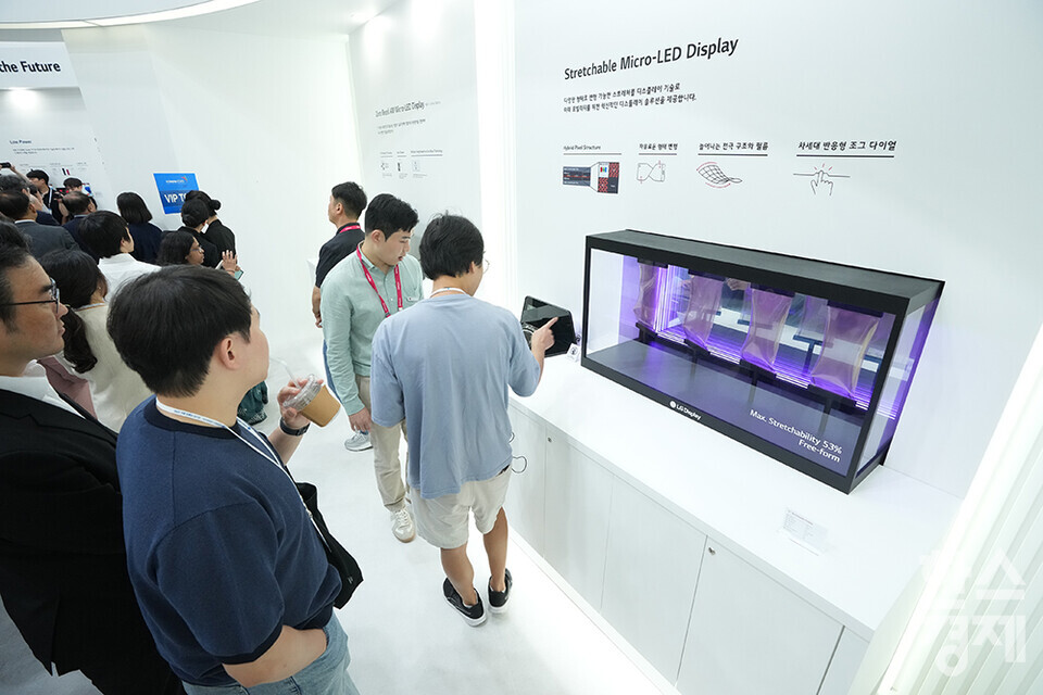 최신 디스플레이 기술을 한자리에서 볼 수 있는 '2025 한국디스플레이산업전시회(K-Display 2025)'가 7일 서울 강남구 코엑스에서 열리고 있다. 관람객들이 LG디스플레이 부스를 찾아 Stretchable Micro-LED Display 제품을 살피고 있다. /최대성 기자 dpdaesung@sporbiz.co.kr 2025.08.07.