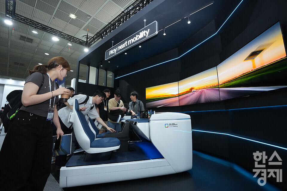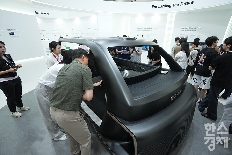 최신 디스플레이 기술을 한자리에서 볼 수 있는 '2025 한국디스플레이산업전시회(K-Display 2025)'가 7일 서울 강남구 코엑스에서 열리고 있다. 관람객들이 LG디스플레이 부스 내부에 최신 디스플레이가 설치된 콘셉트카를 살피고 있다. /최대성 기자 dpdaesung@sporbiz.co.kr 2025.08.07.