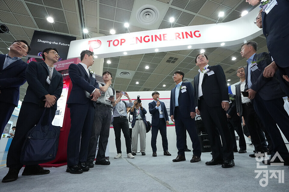 최신 디스플레이 기술을 한자리에서 볼 수 있는 '2025 한국디스플레이산업전시회(K-Display 2025)'가 7일 서울 강남구 코엑스에서 열리고 있다. 관람객들이 탑엔지니어링 부스를 찾아 관계자의 설명을 듣고 있다. /최대성 기자 dpdaesung@sporbiz.co.kr 2025.08.07.