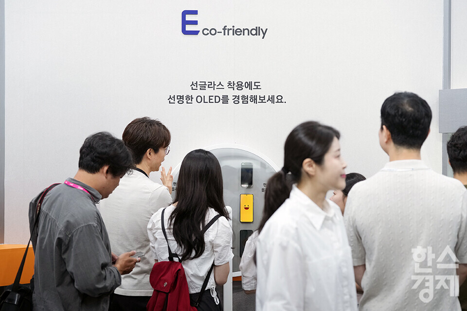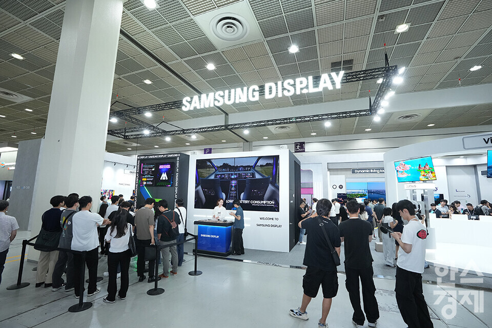 최신 디스플레이 기술을 한자리에서 볼 수 있는 '2025 한국디스플레이산업전시회(K-Display 2025)'가 7일 서울 강남구 코엑스에서 열리고 있다. 관람객들이 삼성디스플레이 부스에 마련된 OLED 전시물을 감상하고 있다. /최대성 기자 dpdaesung@sporbiz.co.kr 2025.08.07.